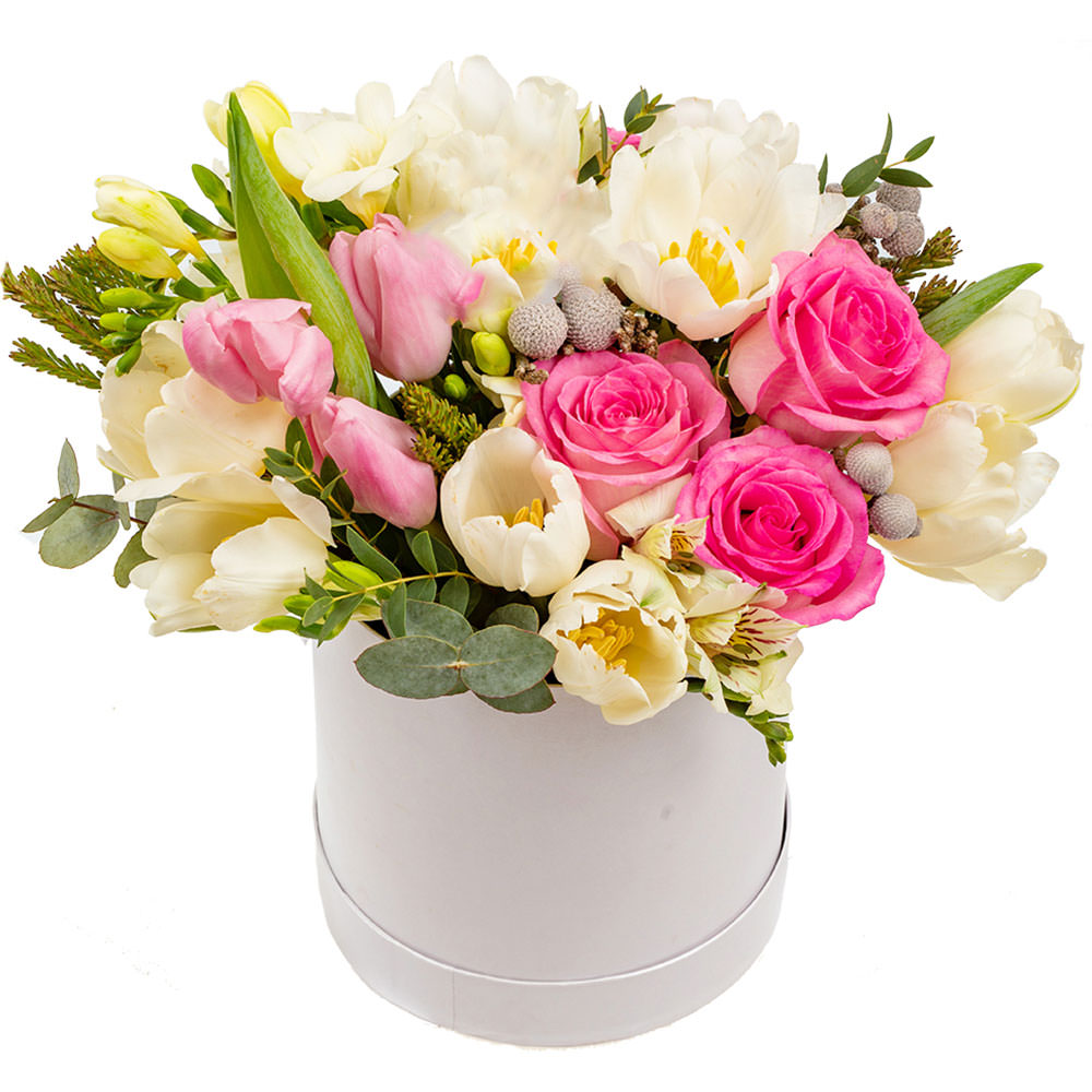 На фото представлен образец. Объем коробки зависит от выбранного вами размера. Точное количество цветов и цветовую гамму вы можете уточнить у менеджера по телефону.